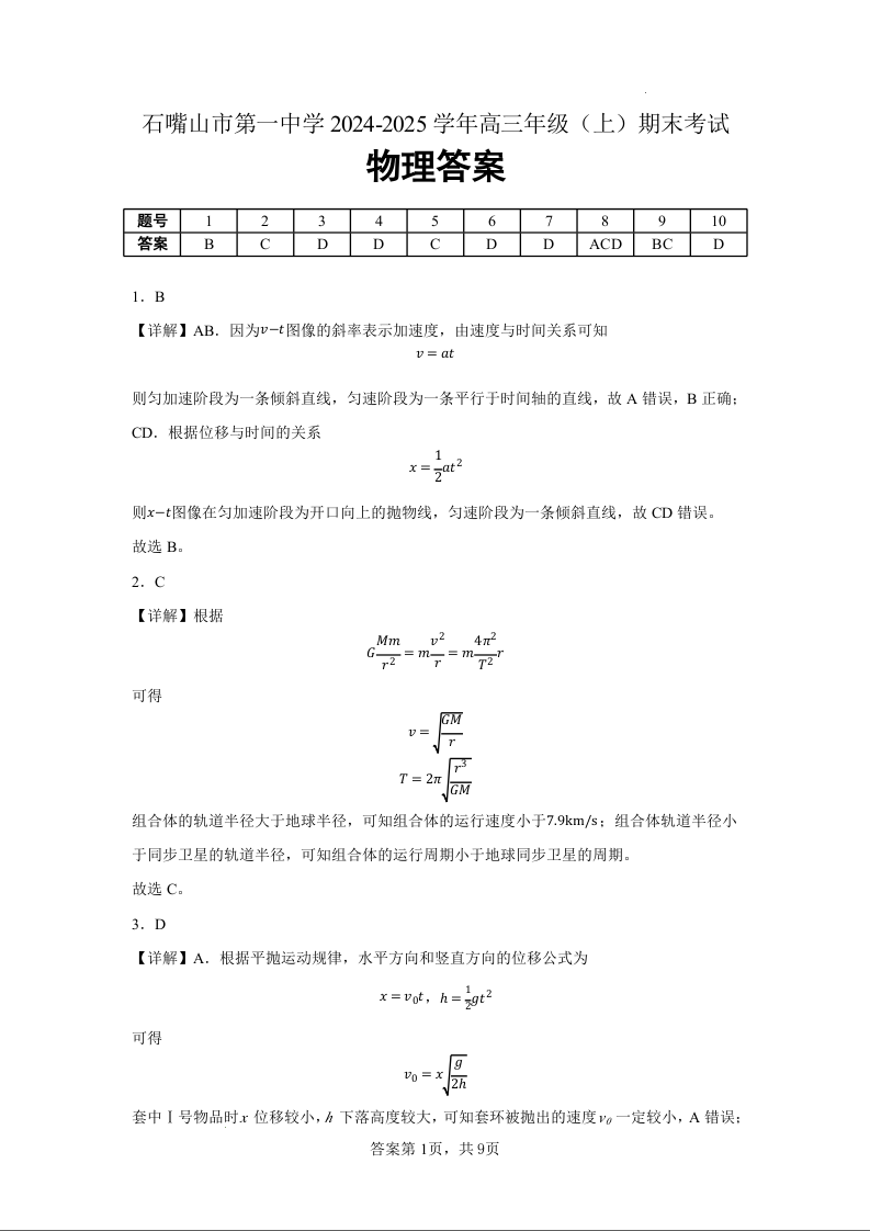 宁夏石嘴山市第一中学2025届上学期1月高三期末考试物理答案