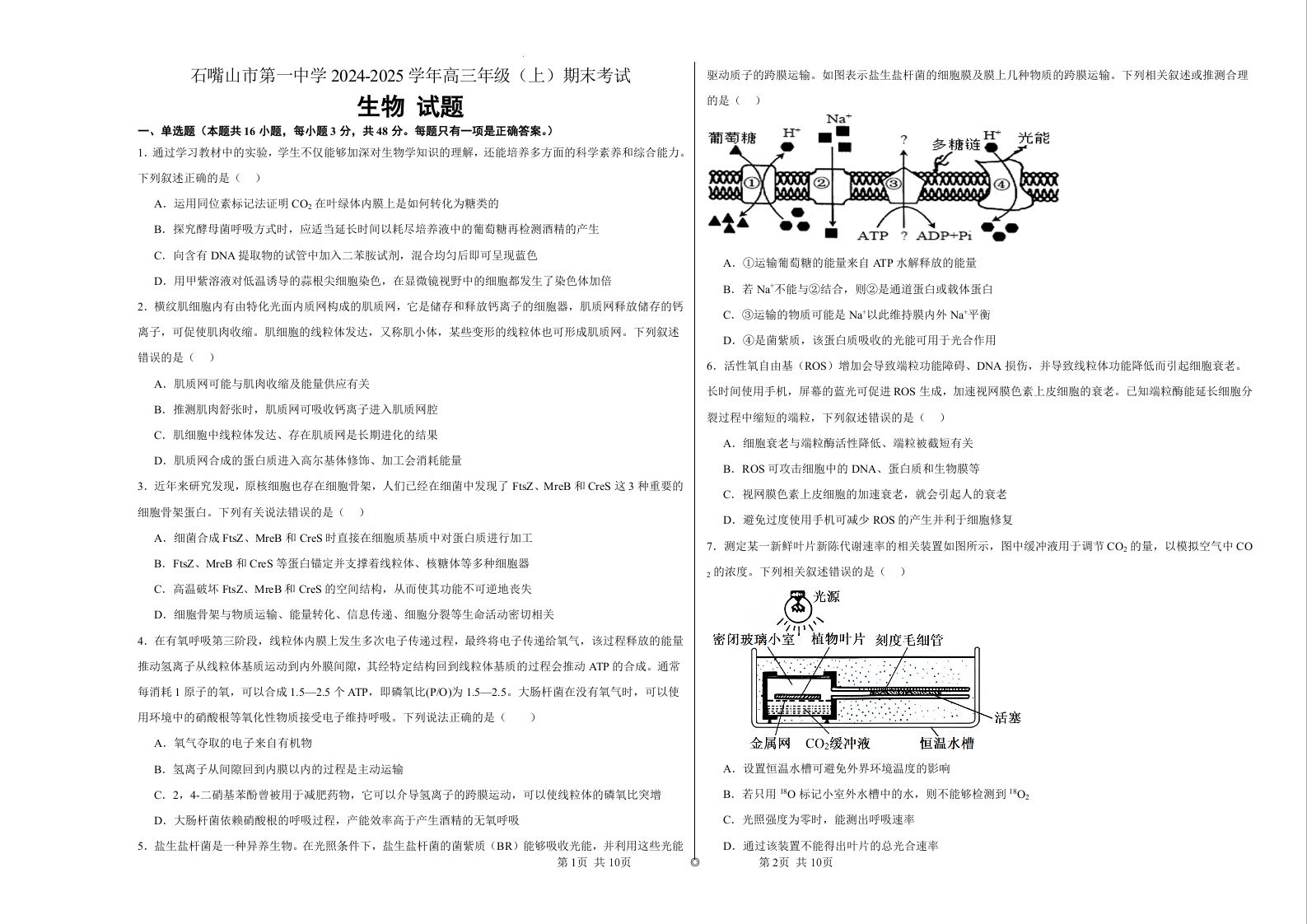 宁夏石嘴山市第一中学2025届上学期1月高三期末考试生物