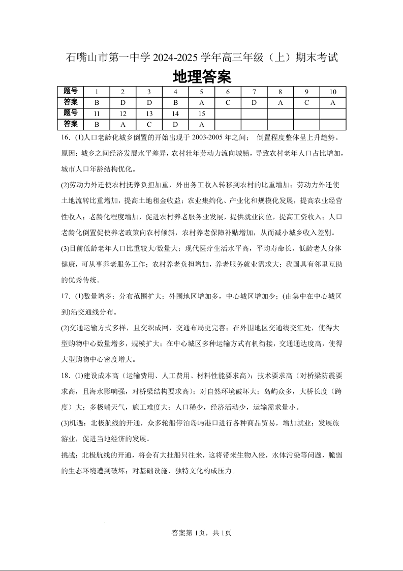 宁夏石嘴山市第一中学2025届上学期1月高三期末考试地理答案