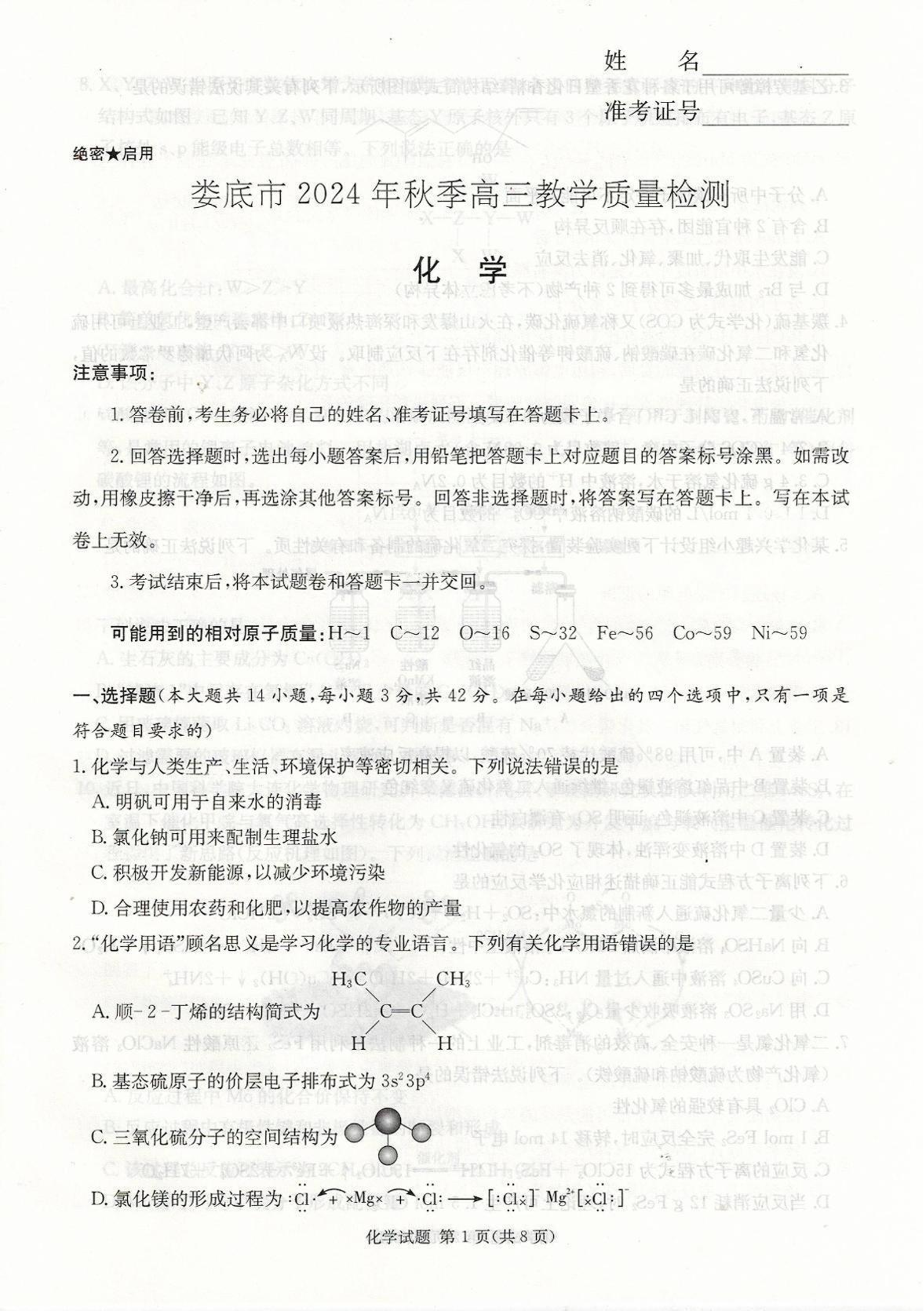 湖南省娄底市2025届高三上学期1月期末质量检测化学+答案