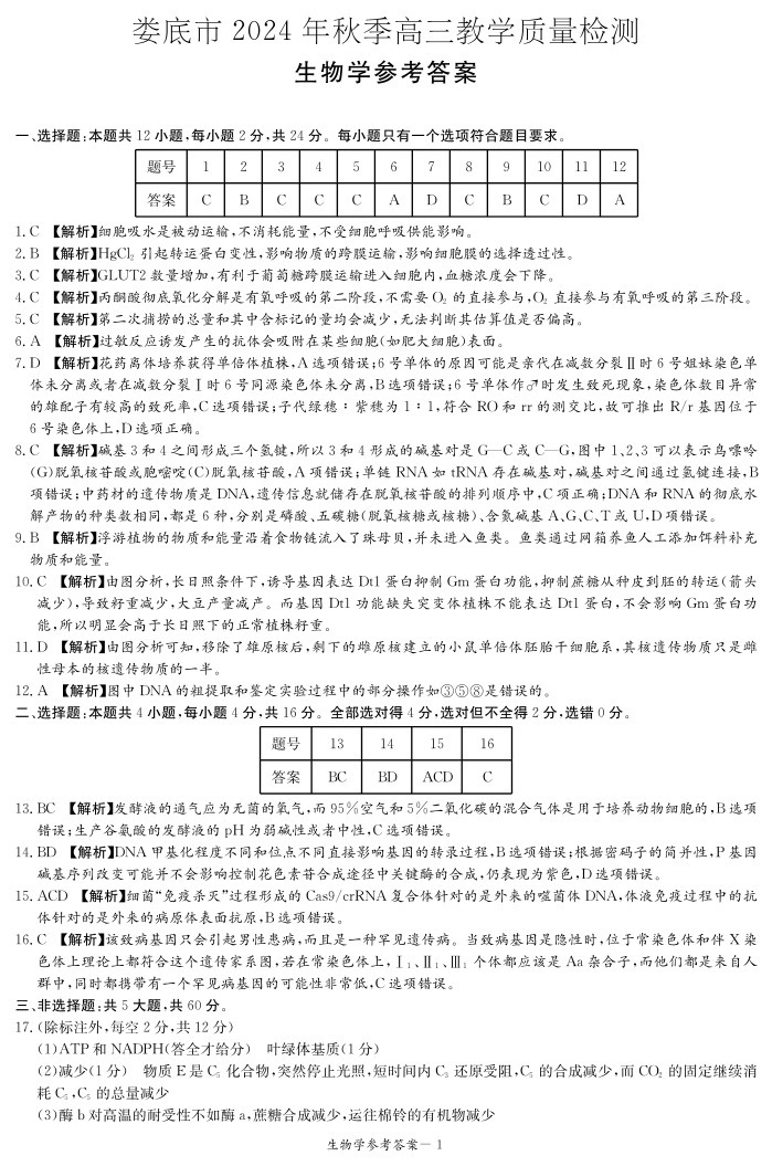 湖南省娄底市2025届上学期1月高三期末质量检测生物答案