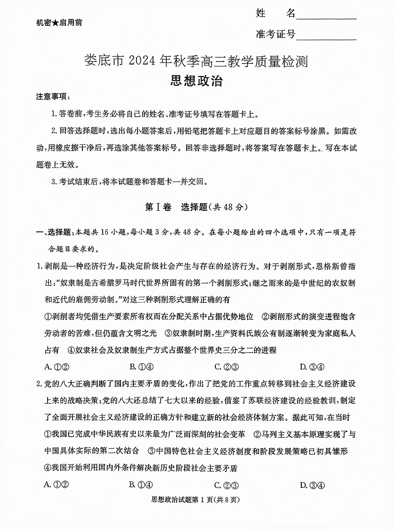 湖南省娄底市2025届上学期1月高三期末质量检测政治