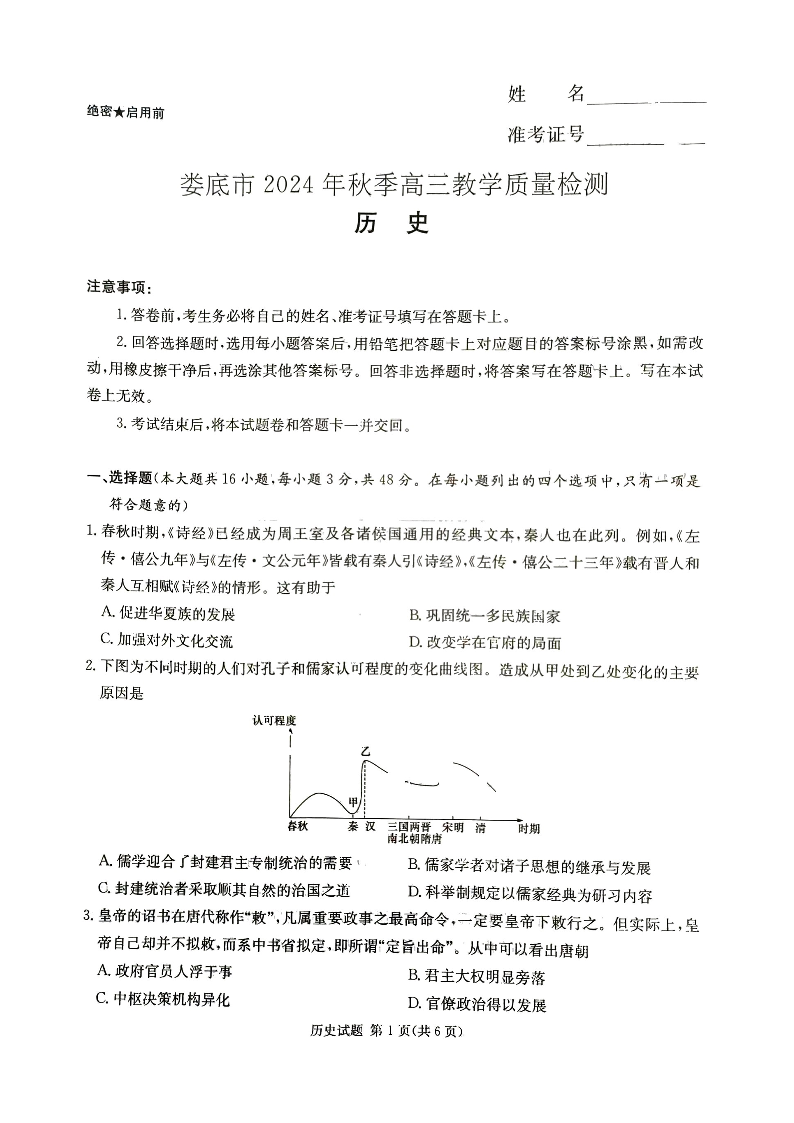 湖南省娄底市2025届上学期1月高三期末质量检测历史