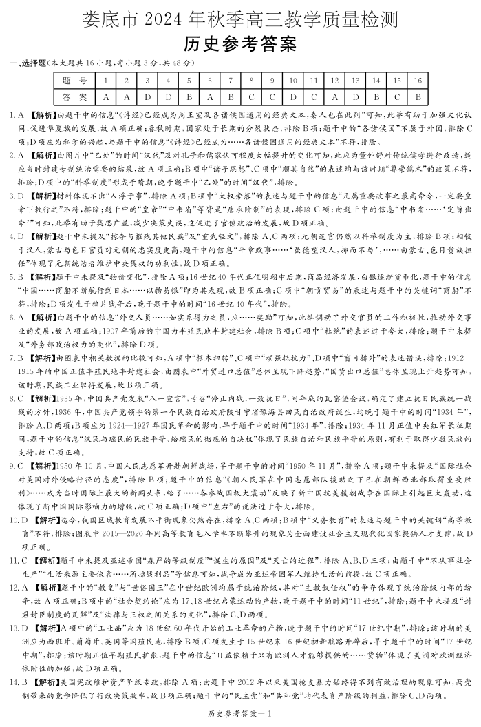 湖南省娄底市2025届上学期1月高三期末质量检测历史答案