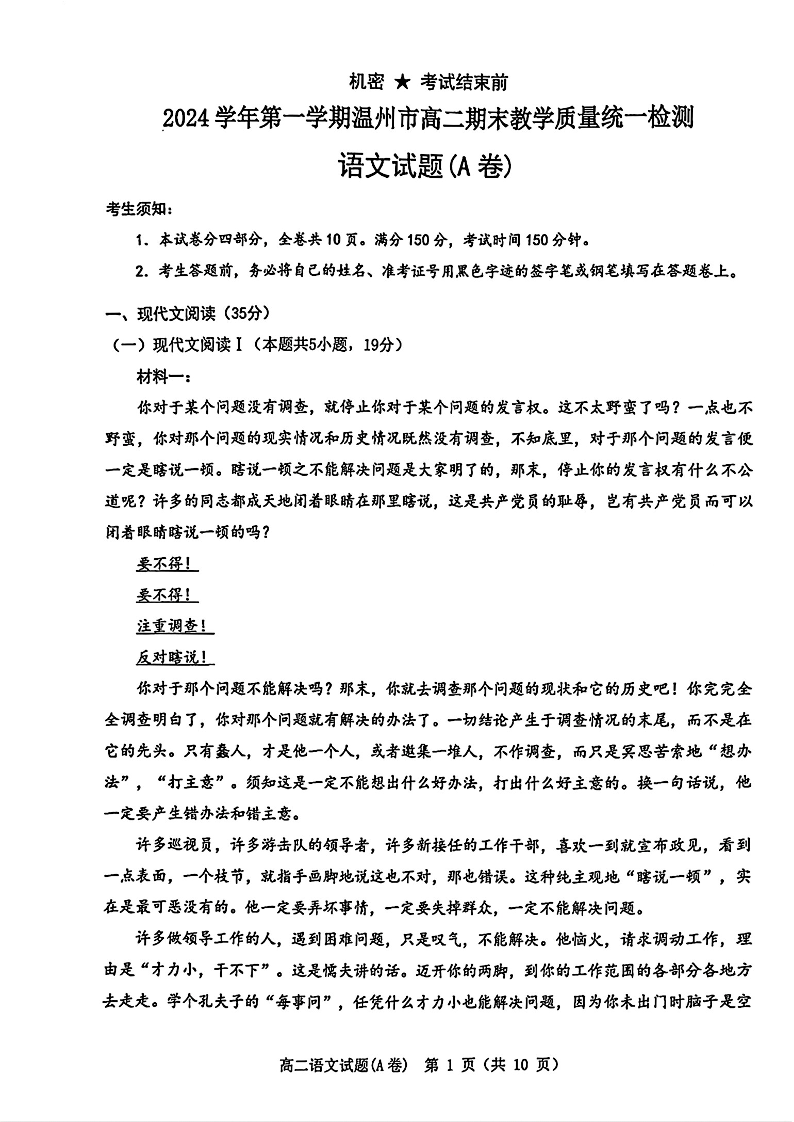 浙江省温州市2024-2025学年上学期1月高二期末教学质量统一检测语文+答案