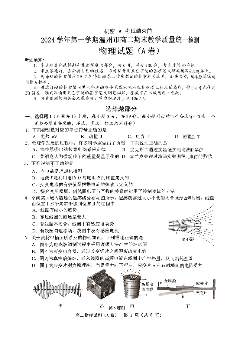 浙江省温州市2024-2025学年上学期1月高二期末教学质量统一检测物理