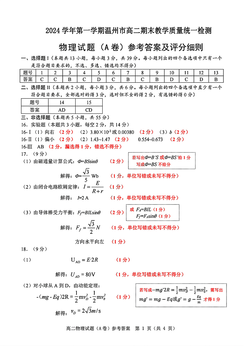 浙江省温州市2024-2025学年上学期1月高二期末教学质量统一检测物理答案