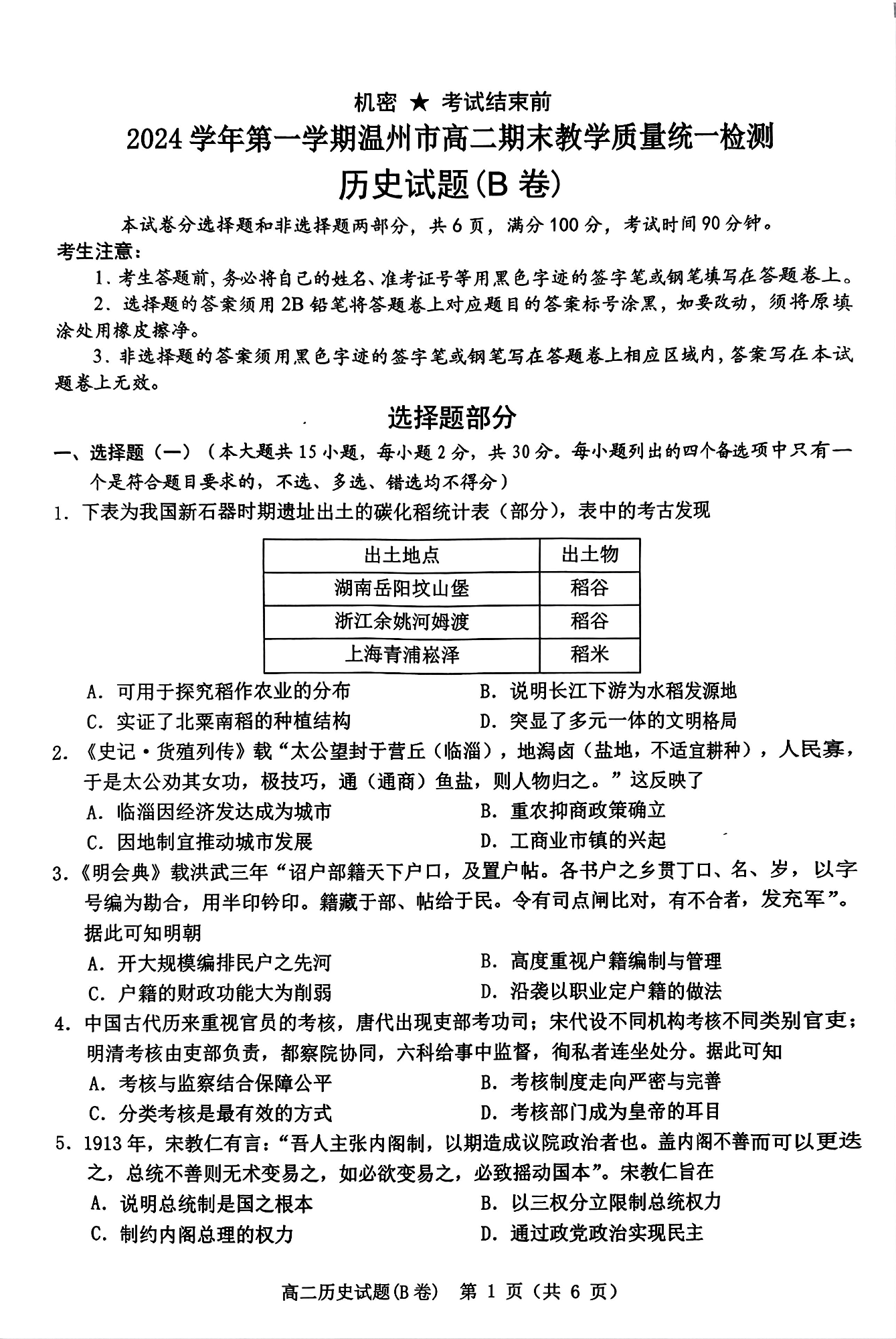 浙江省温州市2024-2025学年上学期1月高二期末教学质量统一检测历史