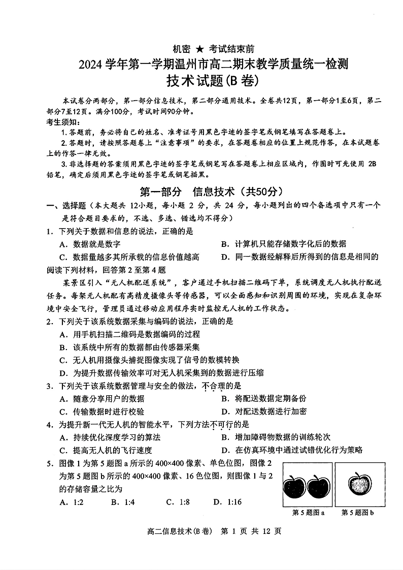 浙江省温州市2024-2025学年上学期1月高二期末教学质量统一检测技术B+答案