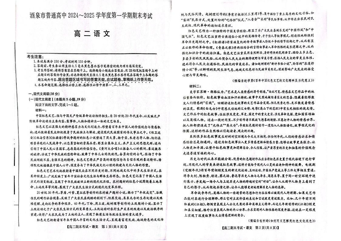 甘肃省酒泉市2024-2025学年上学期1月高二期末考试语文