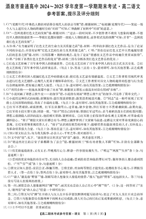 甘肃省酒泉市2024-2025学年上学期1月高二期末考试语文答案