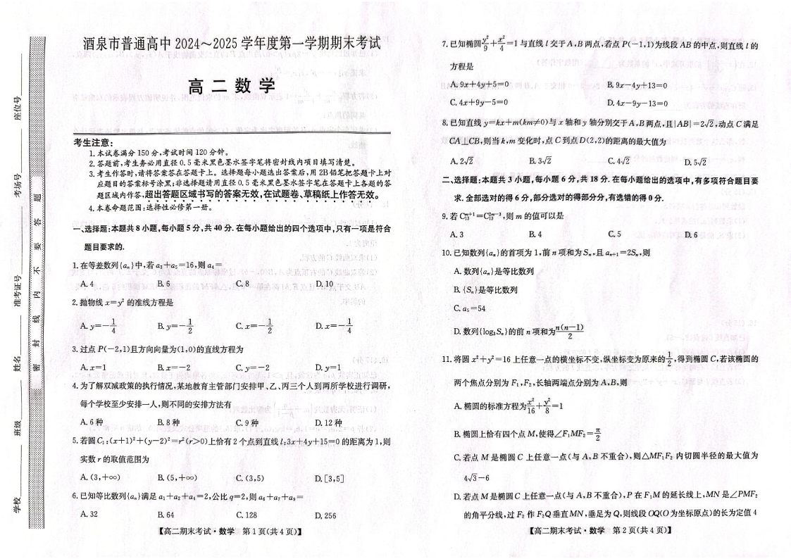 甘肃省酒泉市2024-2025学年上学期1月高二期末考试数学