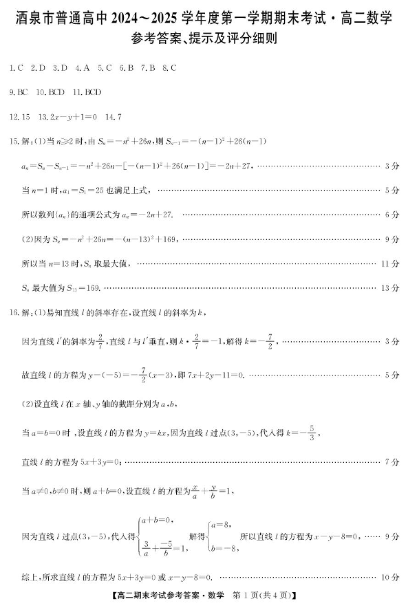 甘肃省酒泉市2024-2025学年上学期1月高二期末考试数学答案