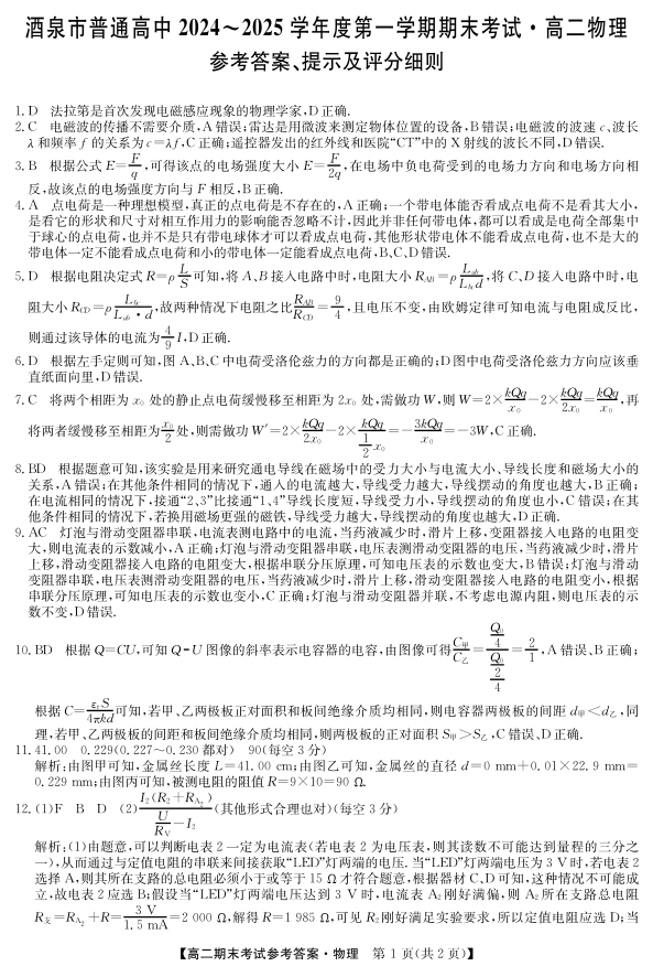 甘肃省酒泉市2024-2025学年上学期1月高二期末考试物理答案