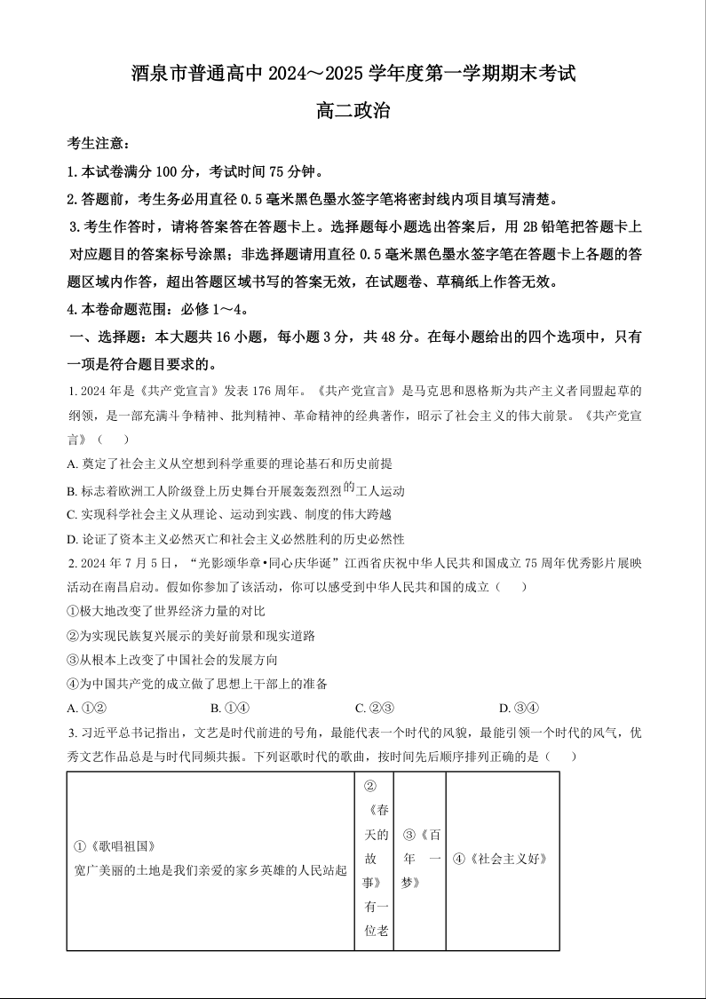 甘肃省酒泉市2024-2025学年上学期1月高二期末考试政治(原卷版)