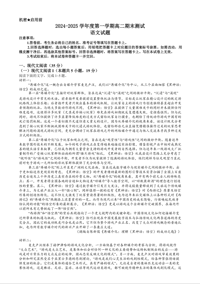 广东省阳江市高新区2024-2025学年上学期1月高二期末考试语文+答案