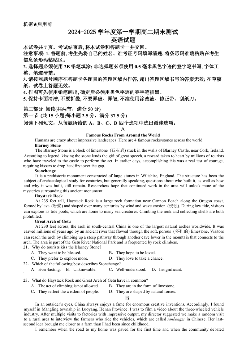 广东省阳江市高新区2024-2025学年上学期1月高二期末考试英语+答案