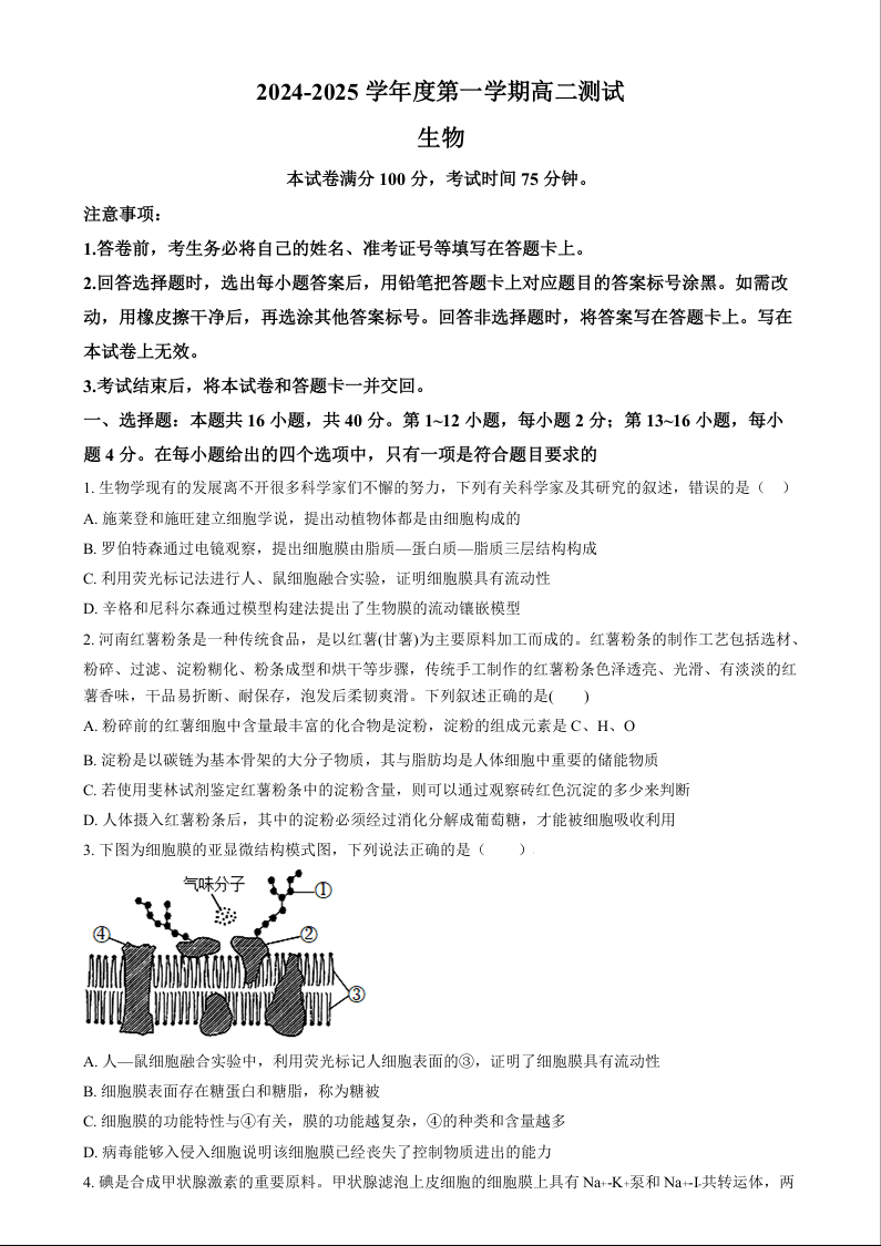 广东省阳江市高新区2024-2025学年上学期1月高二期末考试生物(原卷版)