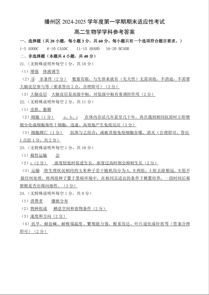 贵州省遵义市播州区2024-2025学年上学期1月高二期末考试生物答案