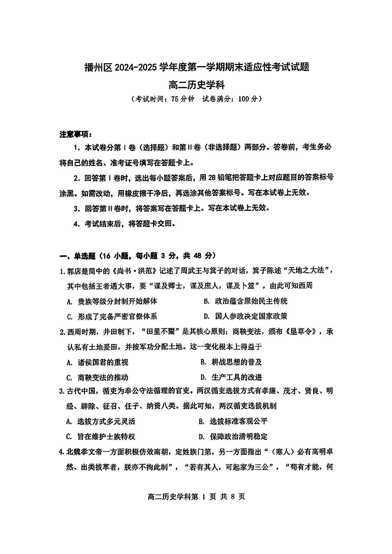 贵州省遵义市播州区2024-2025学年上学期1月高二期末考试历史