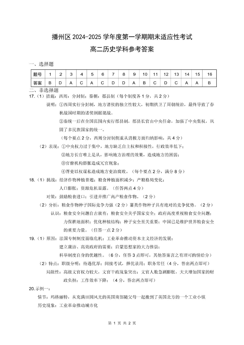 贵州省遵义市播州区2024-2025学年上学期1月高二期末考试历史答案