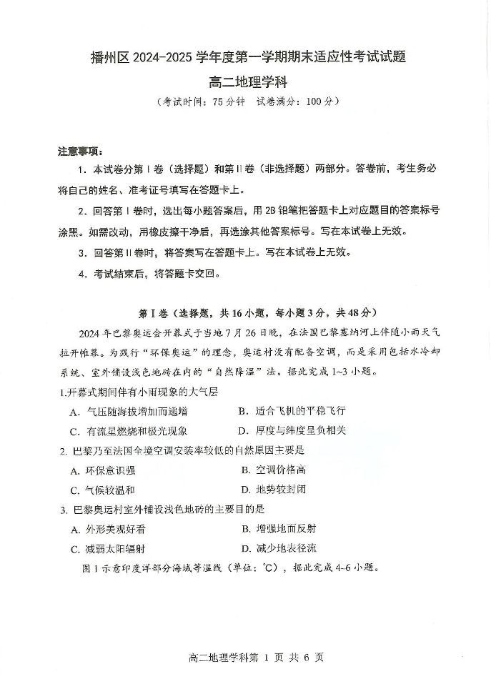 贵州省遵义市播州区2024-2025学年上学期1月高二期末考试地理