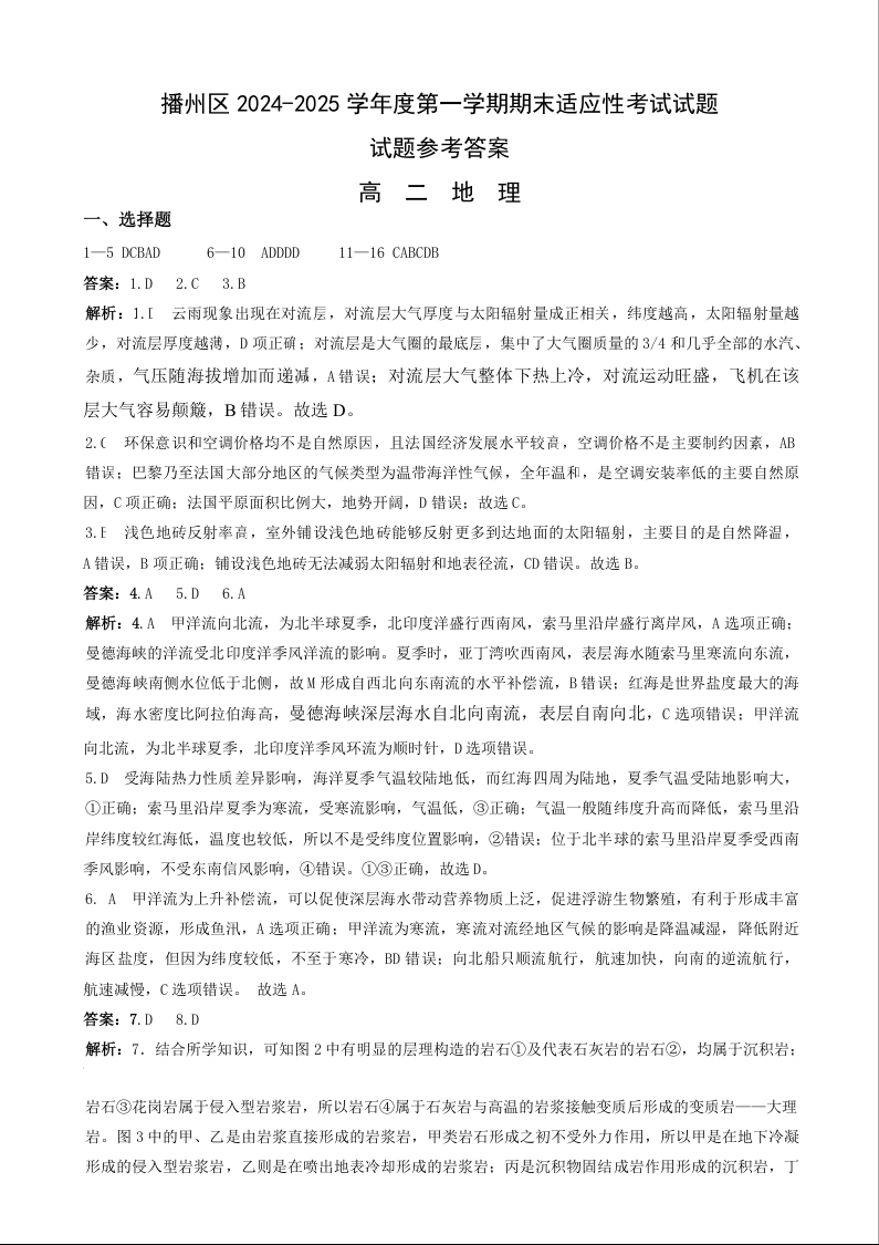 贵州省遵义市播州区2024-2025学年上学期1月高二期末考试地理答案