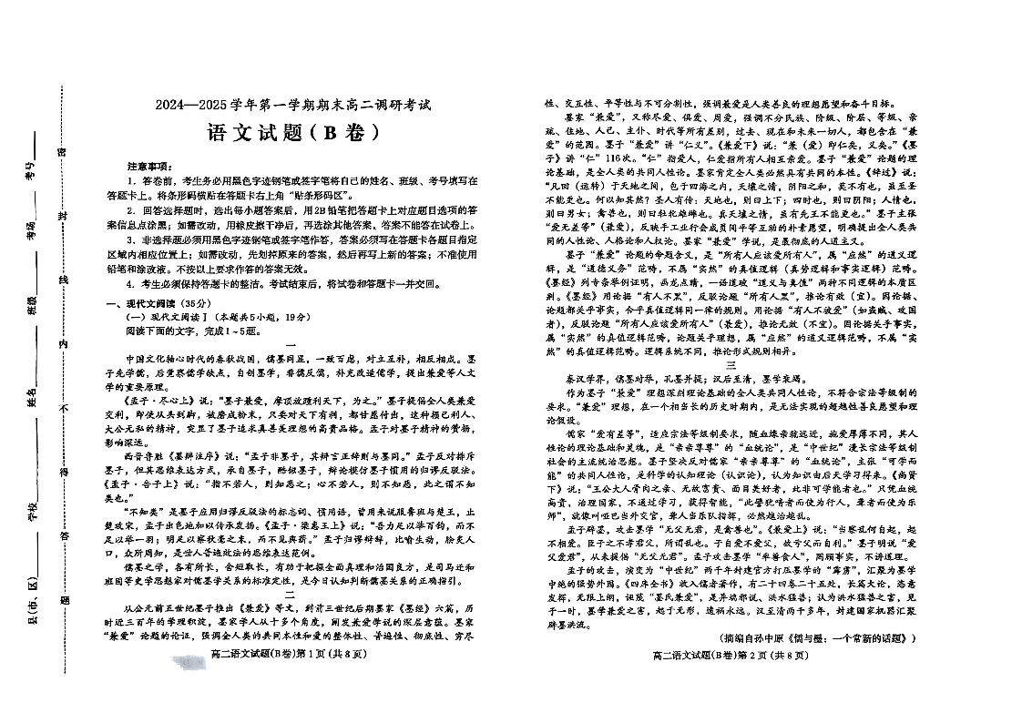 河北省保定市2024-2025学年上学期1月高二期末联考语文