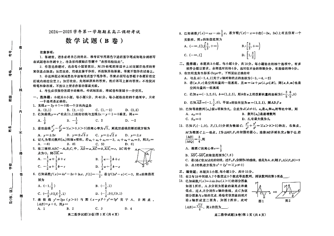 河北省保定市2024-2025学年上学期1月高二期末联考数学