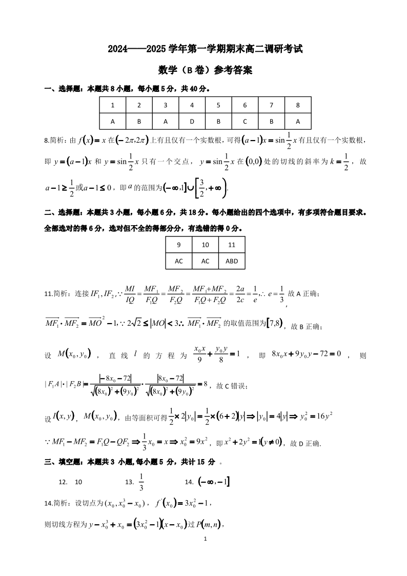 河北省保定市2024-2025学年上学期1月高二期末联考数学答案
