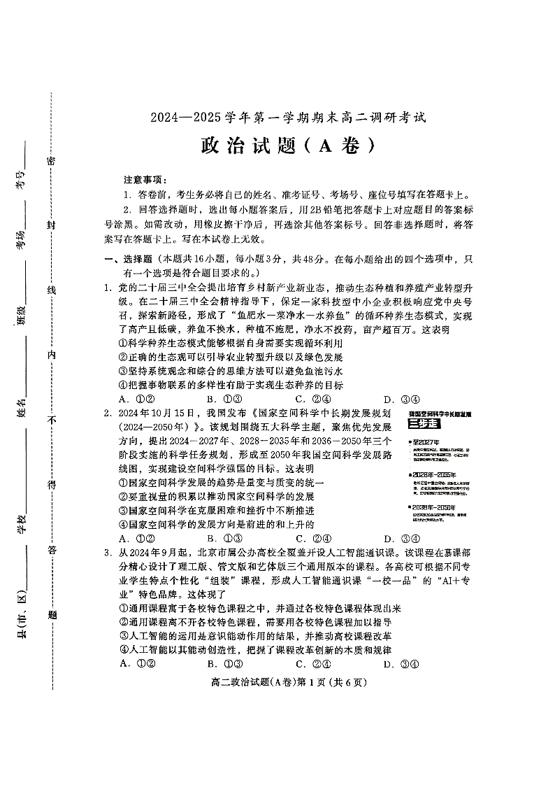 河北省保定市2024-2025学年上学期1月高二期末联考政治