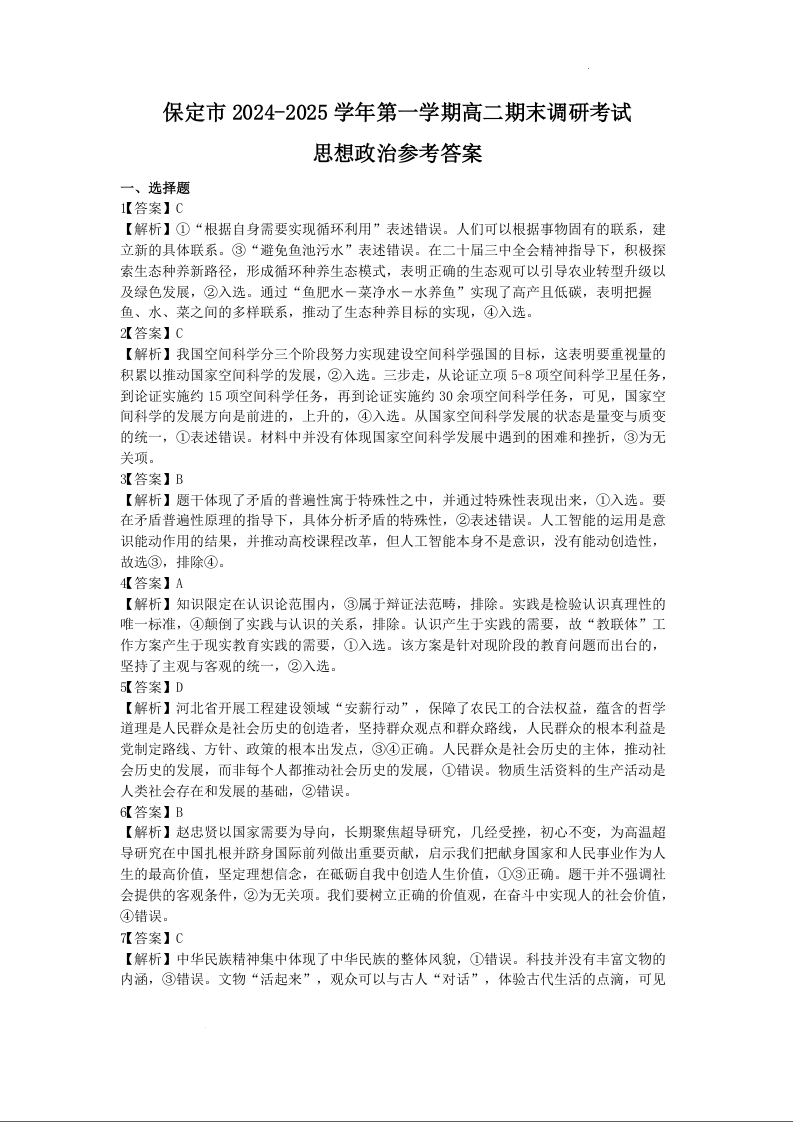 河北省保定市2024-2025学年上学期1月高二期末联考政治答案