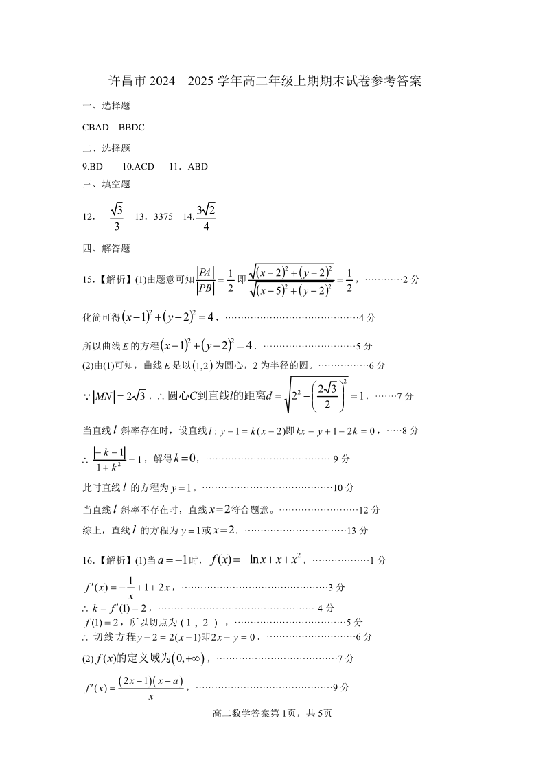 河南省许昌市2024-2025学年上学期1月高二期末考试数学答案