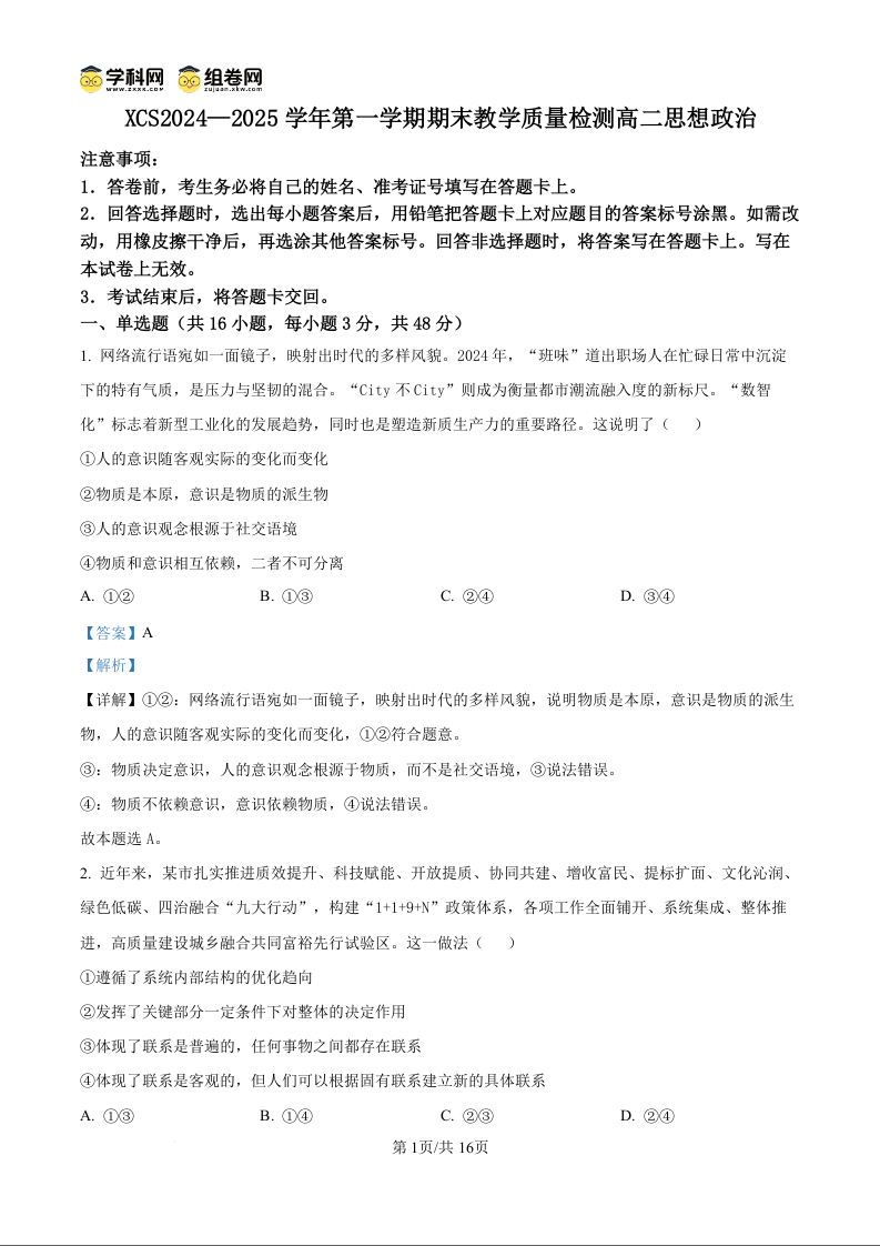 河南省许昌市2024-2025学年上学期1月高二期末考试政治(精品解析版)