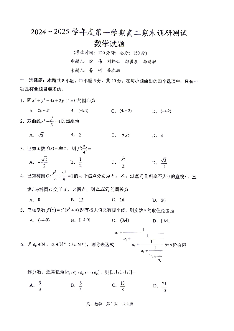 江苏省泰州市2024-2025学年上学期1月高二期末调研测试数学