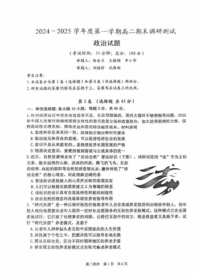 江苏省泰州市2024-2025学年上学期1月高二期末调研测试政治