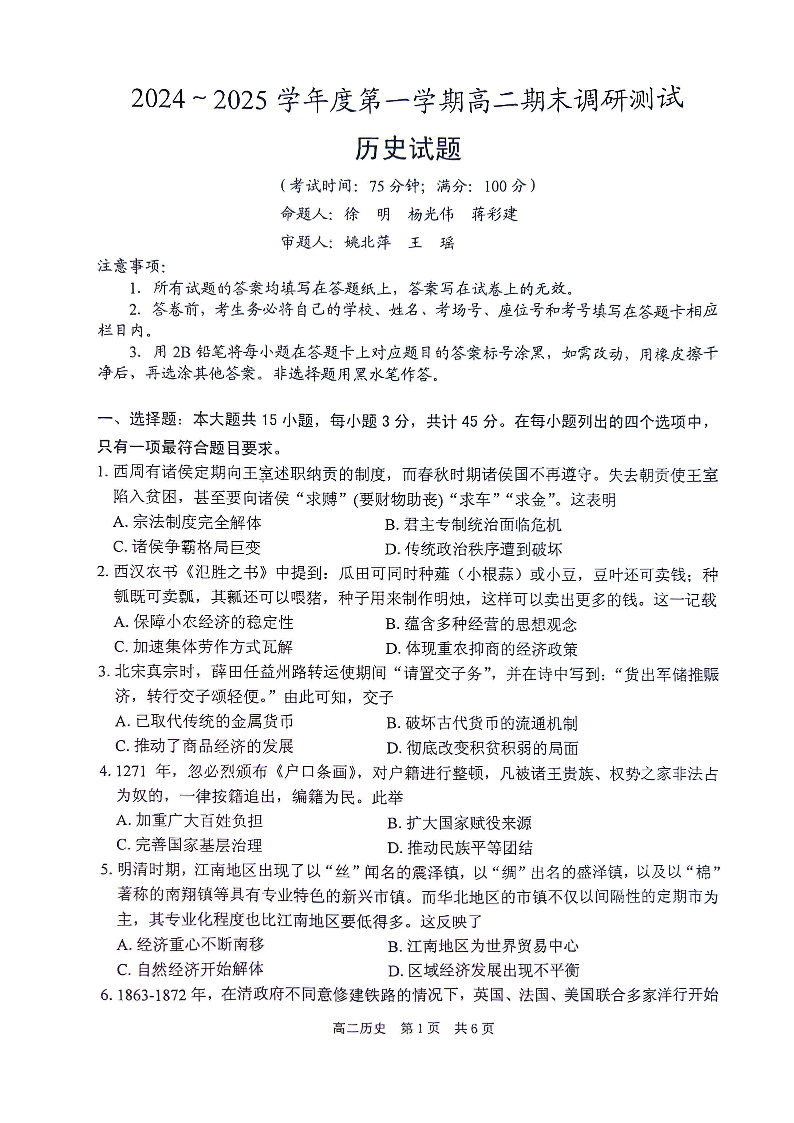 江苏省泰州市2024-2025学年上学期1月高二期末调研测试历史
