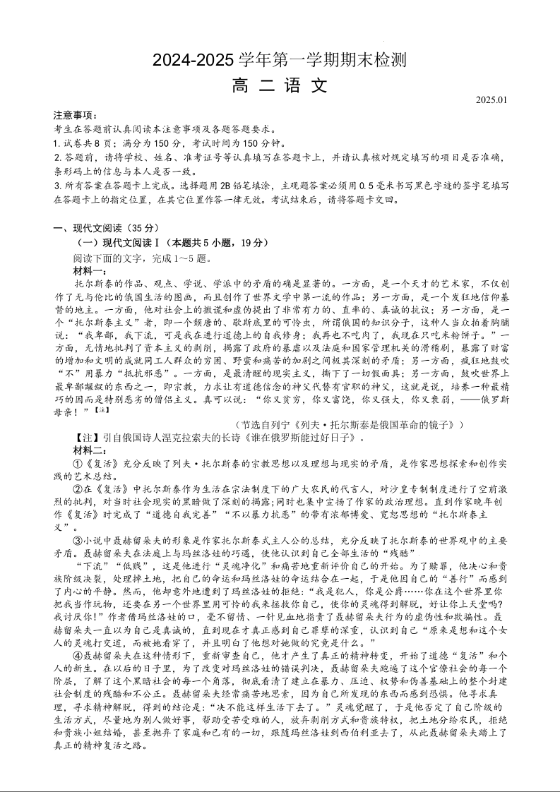 江苏省扬州市2024-2025学年上学期1月高二期末考试语文+答案