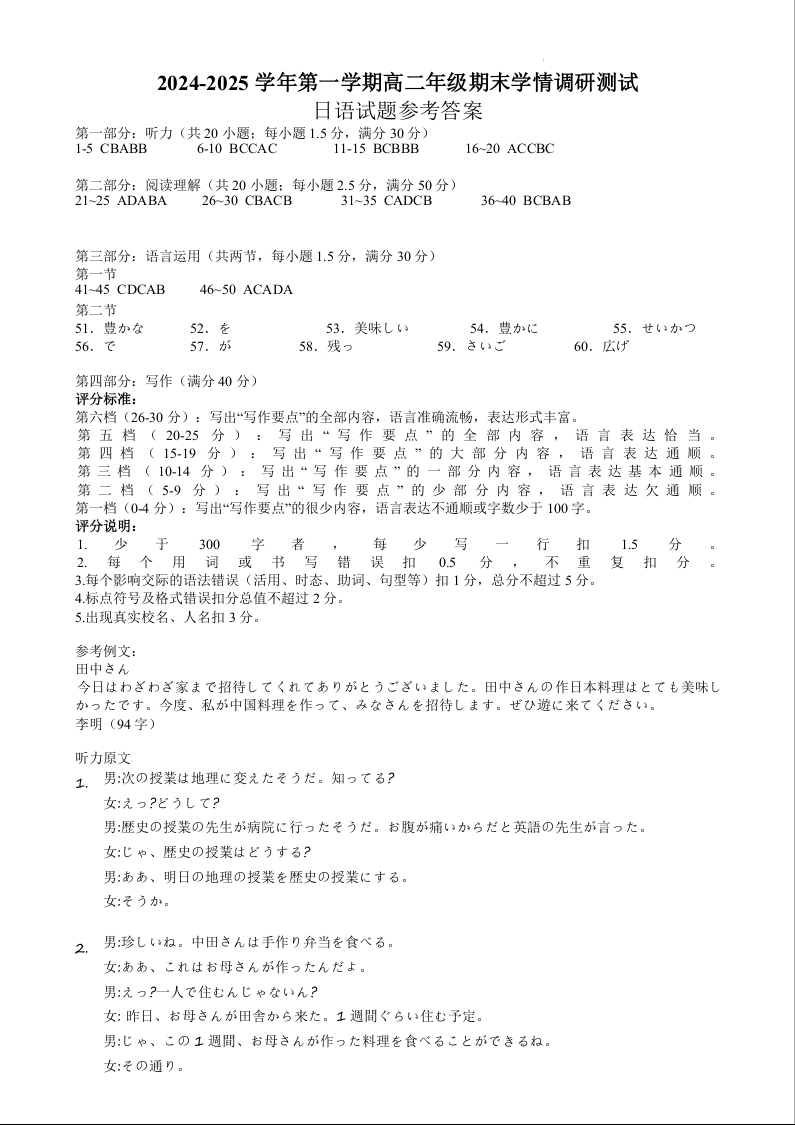 江苏省扬州市2024-2025学年上学期1月高二期末考试日语答案