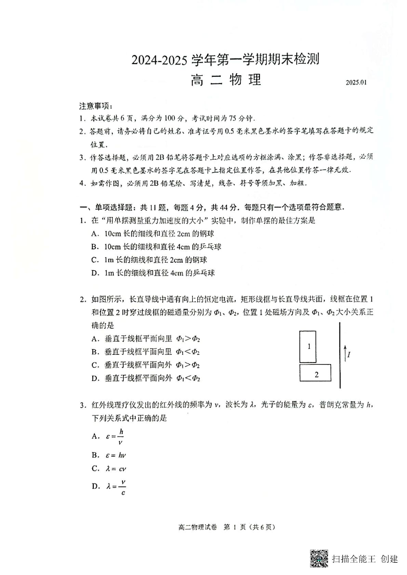 江苏省扬州市2024-2025学年上学期1月高二期末考试物理