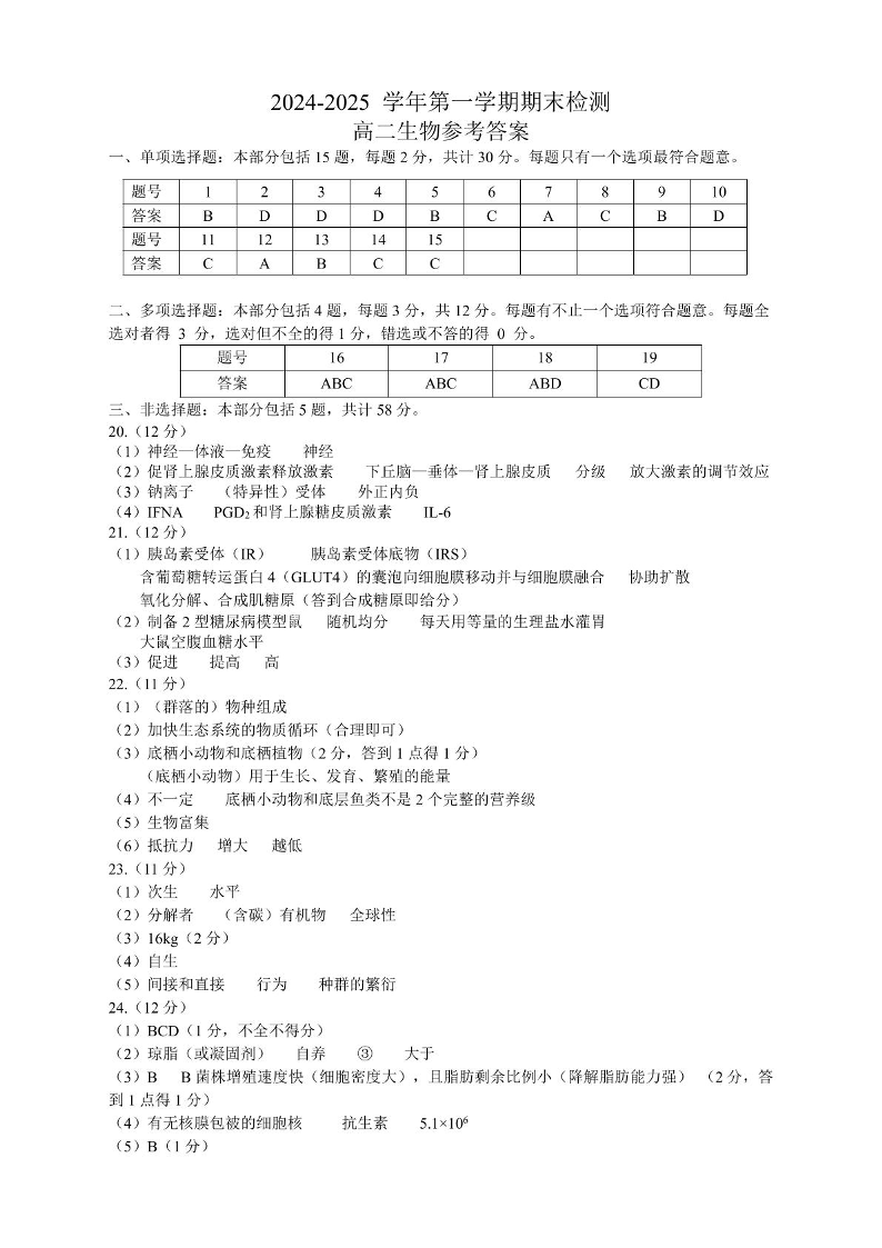 江苏省扬州市2024-2025学年上学期1月高二期末考试生物答案