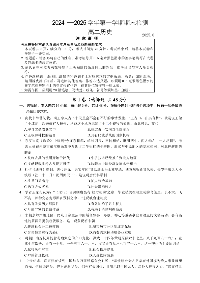 江苏省扬州市2024-2025学年高二上学期期末调研测试历史+答案