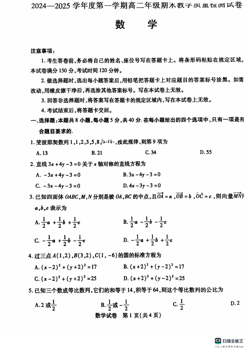 内蒙古包头市2024-2025学年上学期1月高二期末考试数学