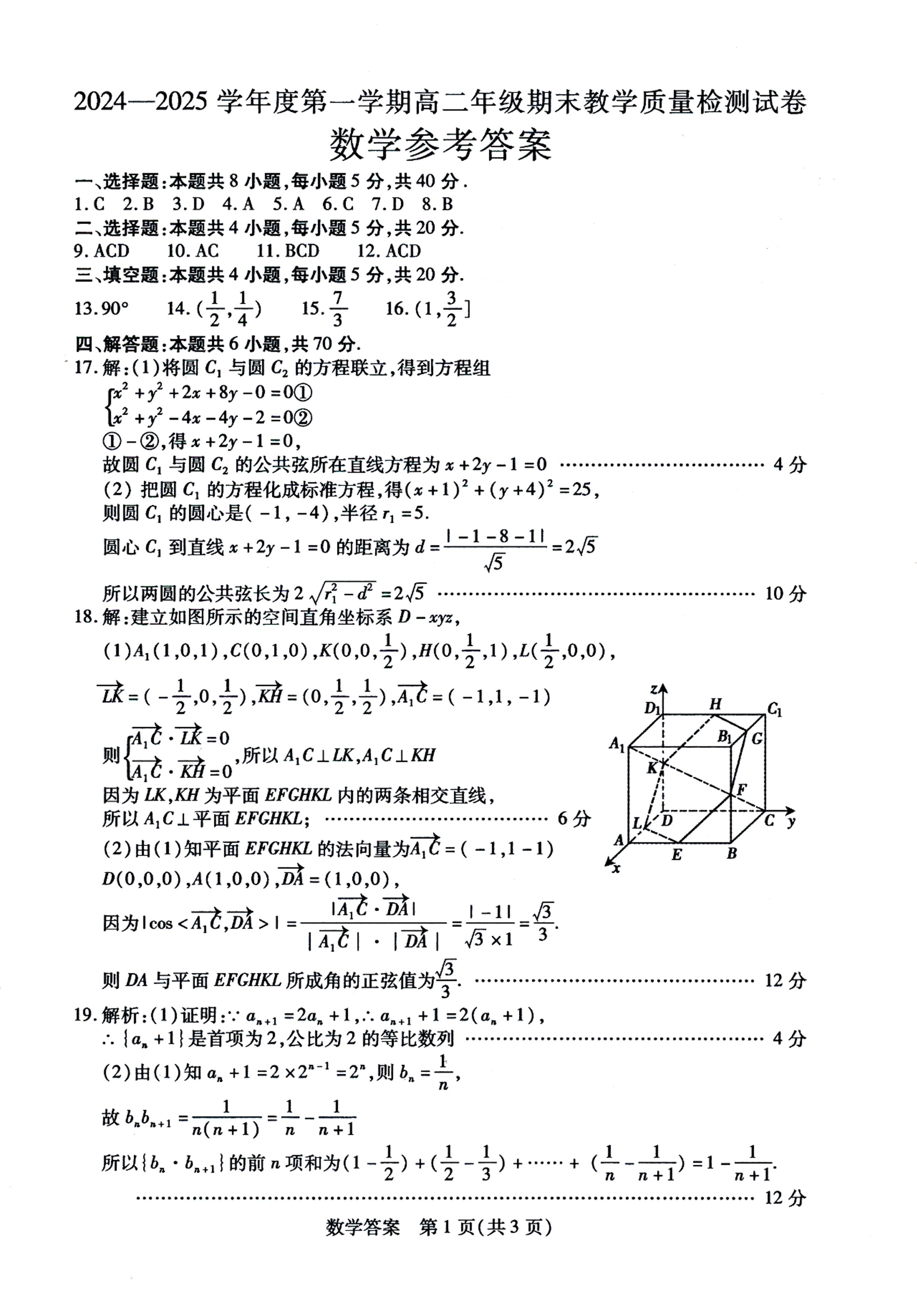内蒙古包头市2024-2025学年上学期1月高二期末考试数学答案