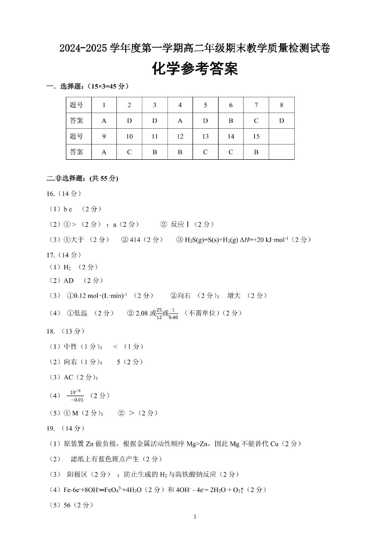 内蒙古包头市2024-2025学年上学期1月高二期末考试化学答案