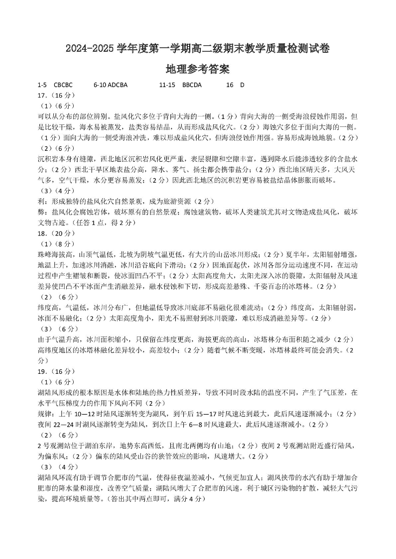 内蒙古包头市2024-2025学年上学期1月高二期末考试地理答案