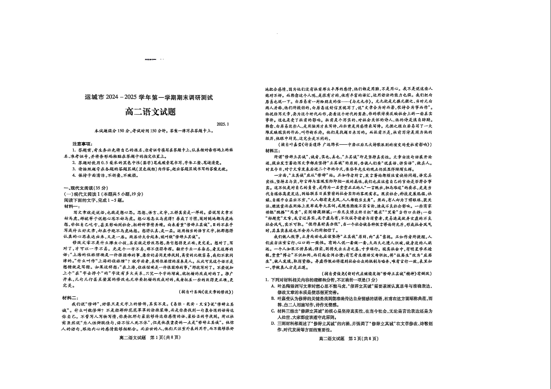 山西省运城市2024-2025学年上学期1月高二期末调研测试语文