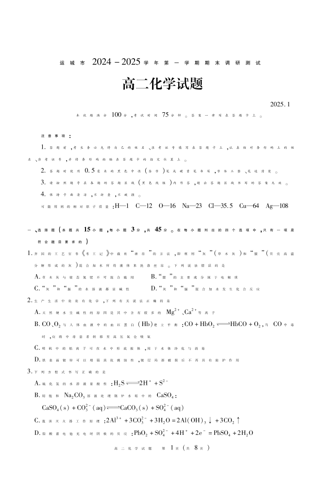 山西省运城市2024-2025学年上学期1月高二期末调研测试化学