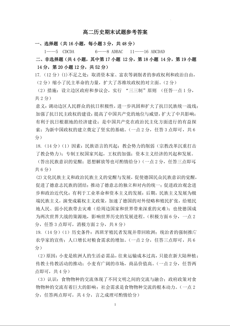 山西省运城市2024-2025学年上学期1月高二期末调研测试历史答案