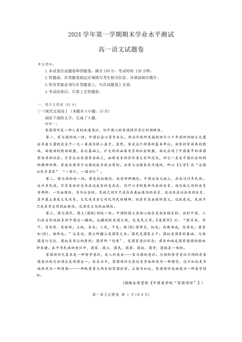 浙江省杭州市2024-2025学年高一上学期1月期末考试语文(A卷)